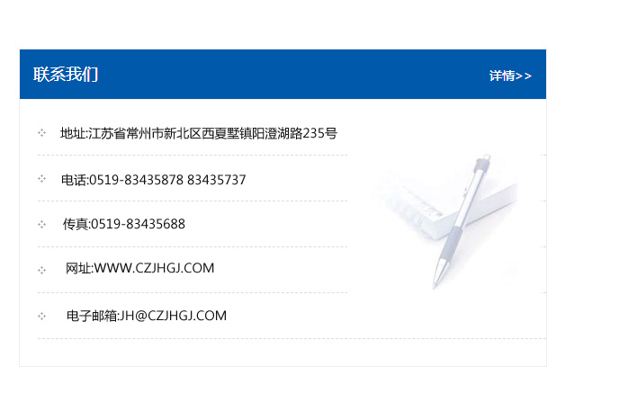地址:常州市新北區友邦商務大廈1幢16、17層  電話:0519-85101652  傳真:0519-85112595  郵編:213022  網址:www_cz-jiayue_cn.dgsenhuang.com  郵箱:xiajifengaa@163.com